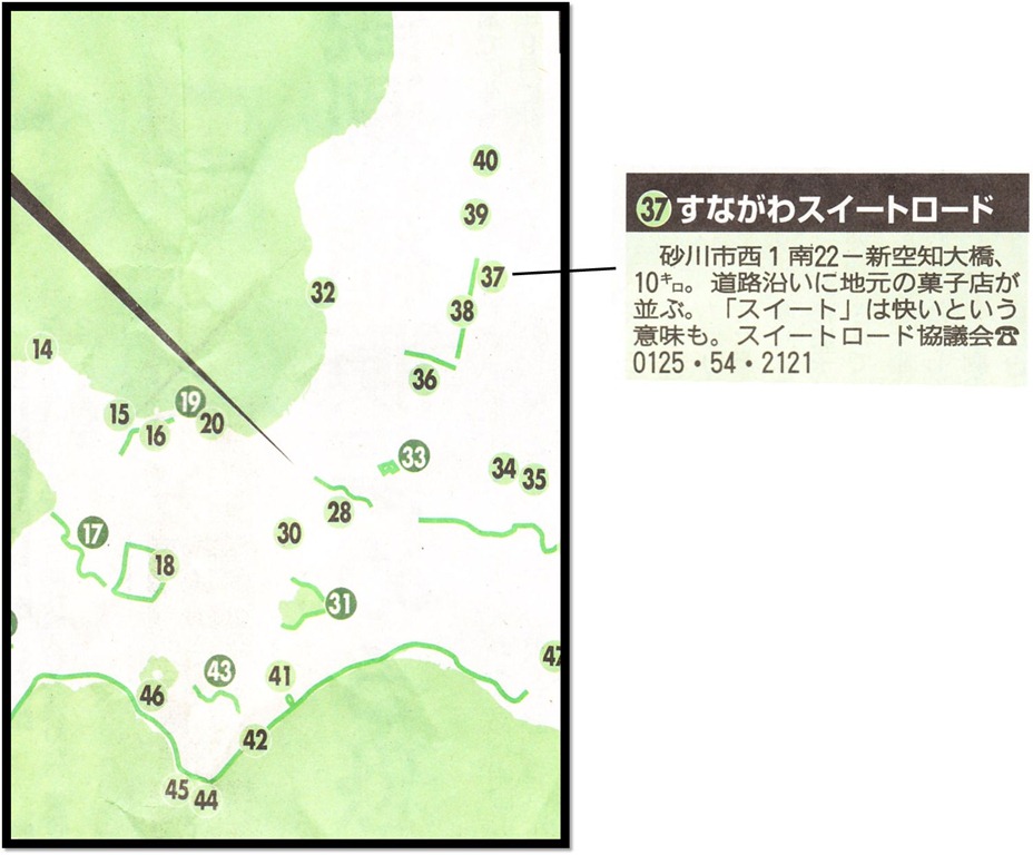 歩くほど魅力発見 「ほっかいどう100の道」 4月4 2012年4月4日(水)北海道新聞、歩くほど魅力発見「ほっかいどう100の道」に記事の中に、”すながわスイートロード”が掲載されています。 砂川市西1南22-新空知大橋、10キロ。道路沿いに地元の菓子店が並ぶ・「スイート」には快という意味も・スイートロード協議会TEL0125・54・2121